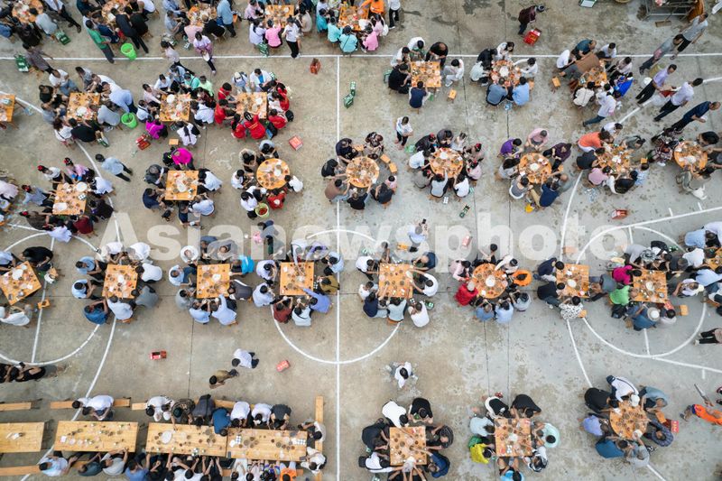 图片说明:2025年9月6日,瑶族同胞在贵州省黔东南苗族侗族自治州从江县翠里乡高华村寨子中的篮球场摆长桌宴迎宾客(无人机照片)。