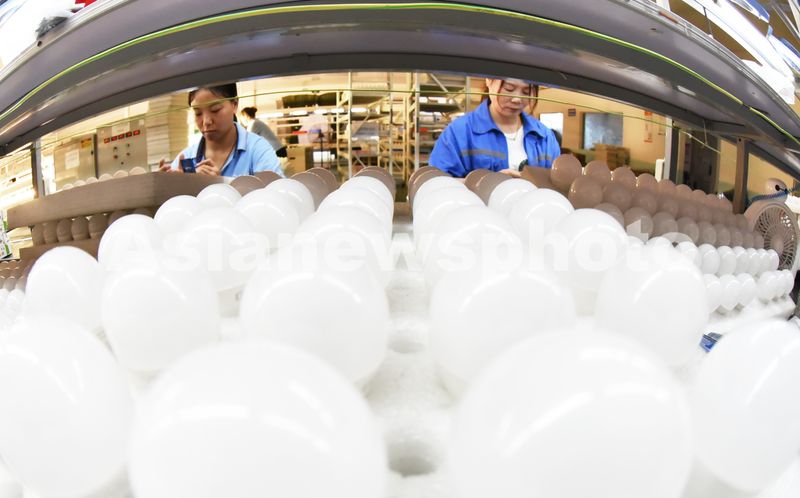 图片说明:2025年9月8日,江苏省连云港市海州区锦屏工业园,工人在生产线上赶制一批LED绿色节能照明灯具。
