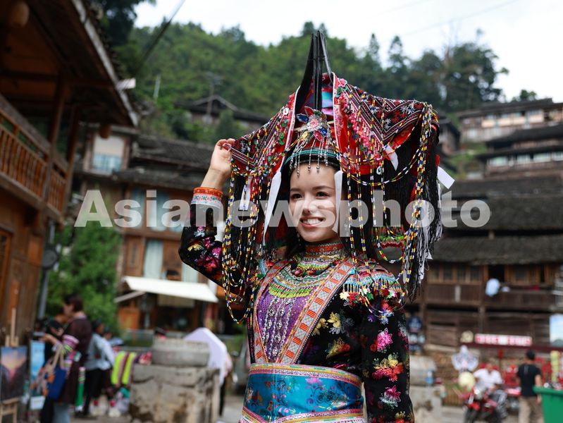 图片说明:2025年9月6日,在贵州省黔东南苗族侗族自治州从江县翠里乡高华村一游客体验瑶族服饰。