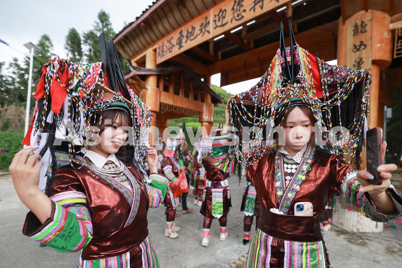 图片说明:2025年9月6日,瑶族同胞在贵州省黔东南苗族侗族自治州从江县翠里乡高华村寨门玩自拍。