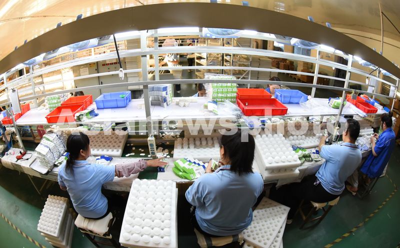 图片说明:2025年9月8日,江苏省连云港市海州区锦屏工业园,工人在生产线上赶制一批LED绿色节能照明灯具。