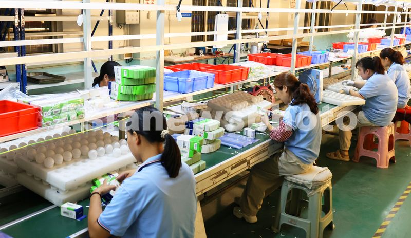 图片说明:2025年9月8日,江苏省连云港市海州区锦屏工业园,工人在生产线上赶制一批LED绿色节能照明灯具。