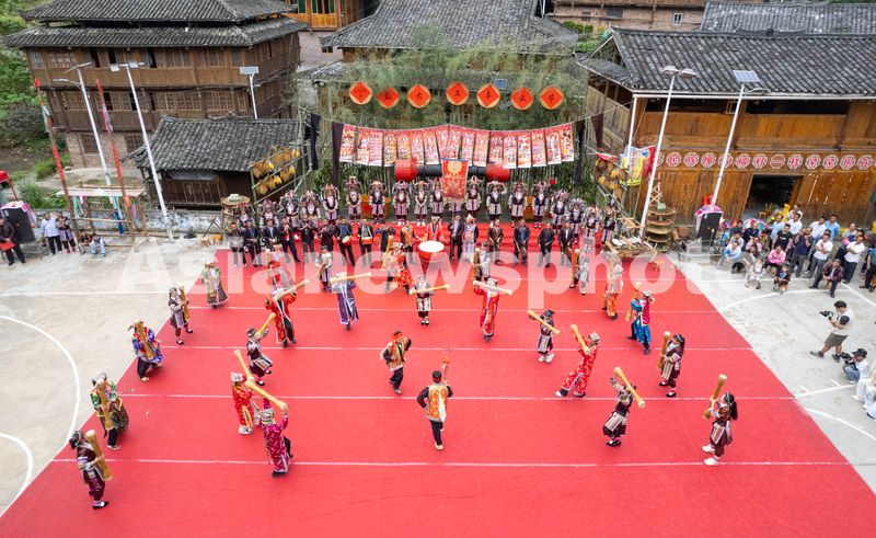 图片说明:2025年9月6日,瑶族同胞在贵州省黔东南苗族侗族自治州从江县翠里乡高华村开展丰富多彩的活动欢庆瑶族盘古王丰收节(无人机图片)。