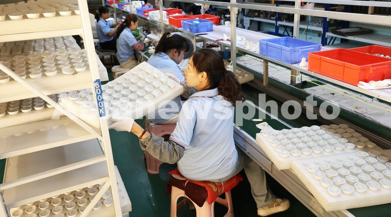 图片说明:2025年9月8日,江苏省连云港市海州区锦屏工业园,工人在生产线上赶制一批LED绿色节能照明灯具。