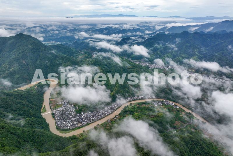 2025年9月9日,在安徽省黄山市歙县杞梓里镇坡山村拍摄的烟雨流云美景。