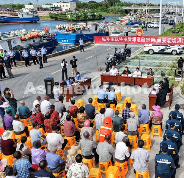 图片说明:2025年9月11日,江苏省如皋市人民法院环境资源法庭在海安市滨海新区老坝港社区公开审理一起非法捕捞水产品案。