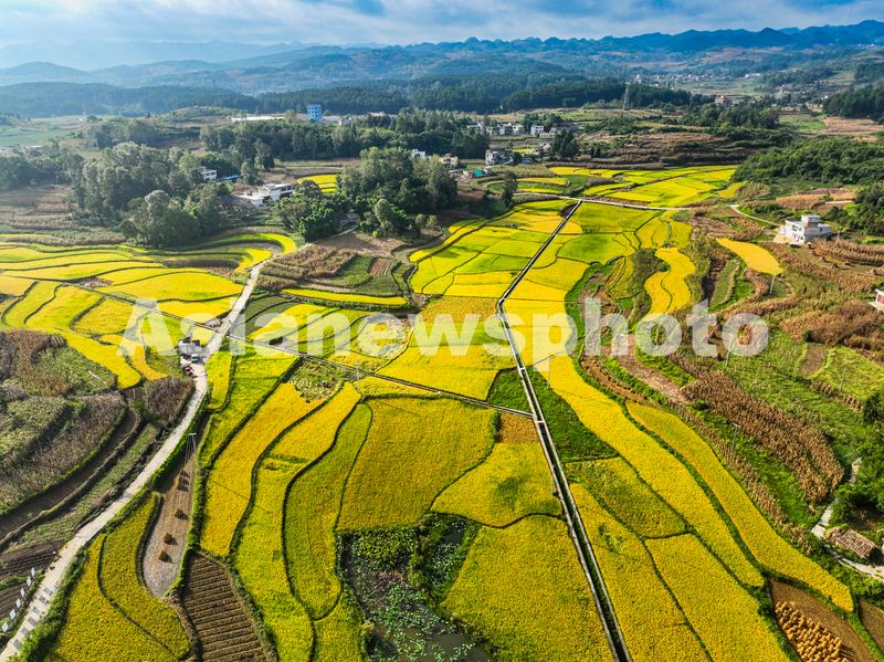 图片说明:2025年9月15日,贵州省黔西市雨朵镇土城村田园,阳光下,金黄的水稻与山林、村庄构成一幅幅丰收的画卷,美不胜收。