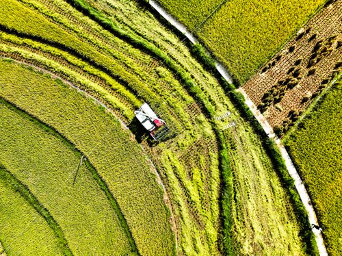 图片说明:2025年9月15日,贵州省黔西市雨朵镇铧口寨社区田园,阳光下,金黄的水稻与山林、村庄构成一幅幅丰收的画卷,美不胜收。