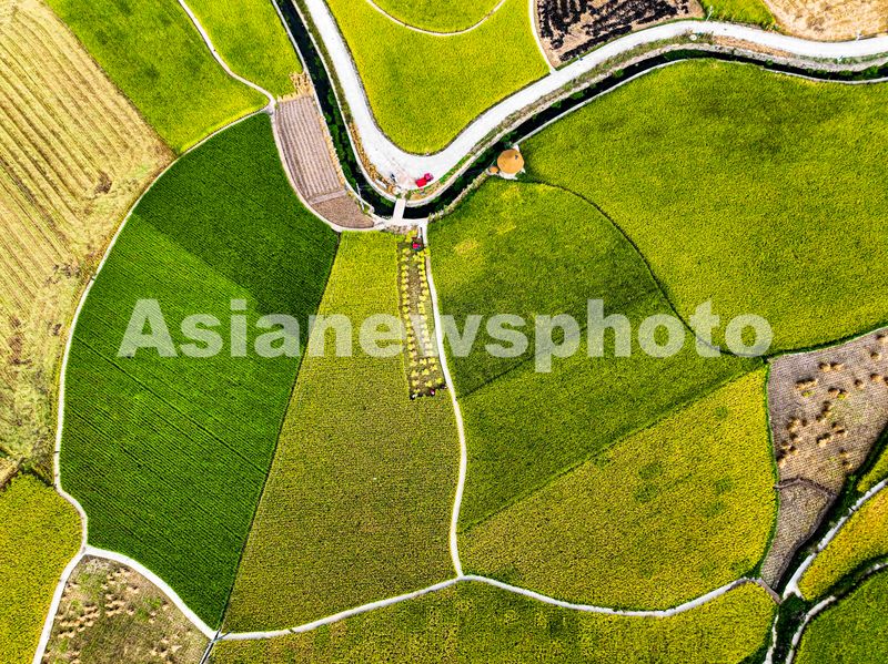 图片说明:2025年9月15日,贵州省黔西市雨朵镇铧口寨社区田园,阳光下,金黄的水稻与山林、村庄构成一幅幅丰收的画卷,美不胜收。