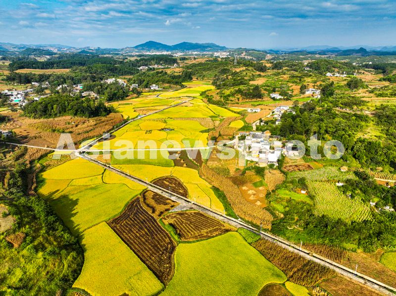 图片说明:2025年9月15日,贵州省黔西市雨朵镇土城村田园,阳光下,金黄的水稻与山林、村庄构成一幅幅丰收的画卷,美不胜收。