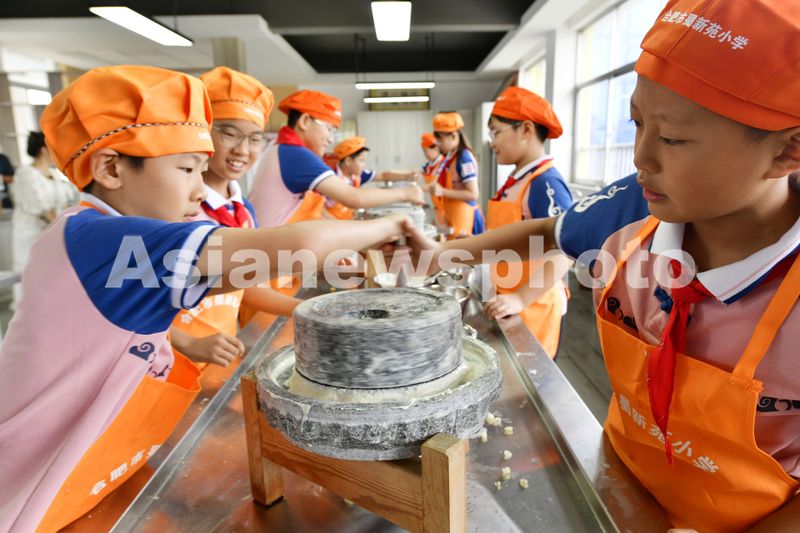 图片说明:2025年9月15日,在安徽省合肥市蜀山区蜀新苑小学“豆腐坊”里,高年级学生在磨豆浆,准备做豆腐。