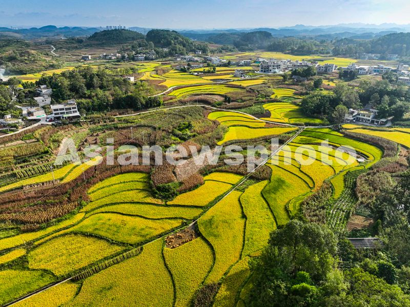 图片说明:2025年9月15日,贵州省黔西市雨朵镇土城村田园,阳光下,金黄的水稻与山林、村庄构成一幅幅丰收的画卷,美不胜收。