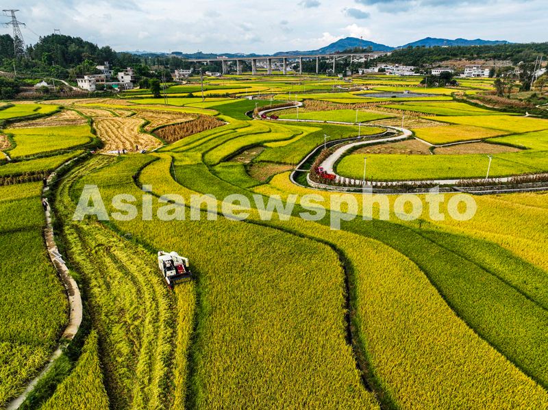 图片说明:2025年9月15日,贵州省黔西市雨朵镇铧口寨社区田园,阳光下,金黄的水稻与山林、村庄构成一幅幅丰收的画卷,美不胜收。