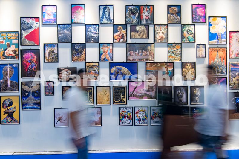 图片说明:2025年9月18日,浙江省金华市义乌国际博览中心里,国内外客商在第 25 届中国框业与装饰画展览会上参观洽谈中。