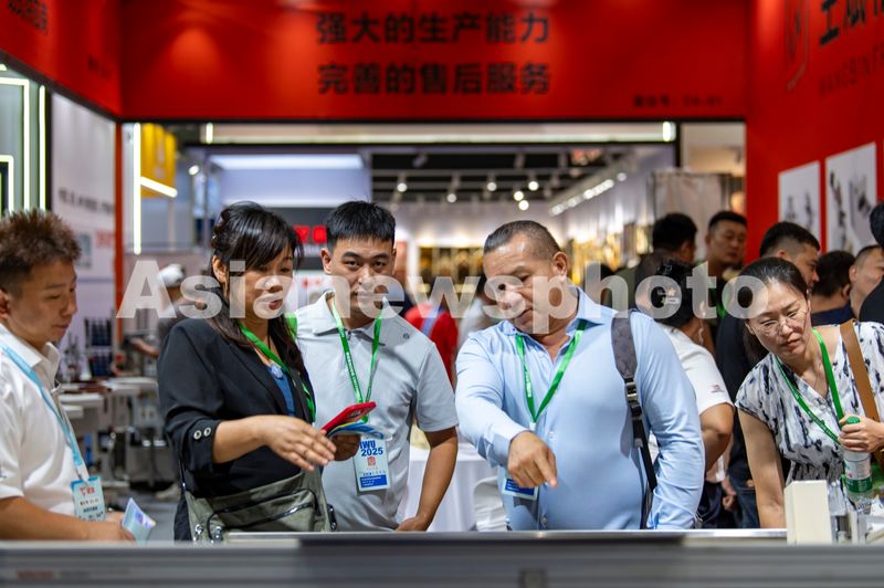 图片说明:2025年9月18日,浙江省金华市义乌国际博览中心里,国内外客商在第 25 届中国框业与装饰画展览会上参观洽谈中。