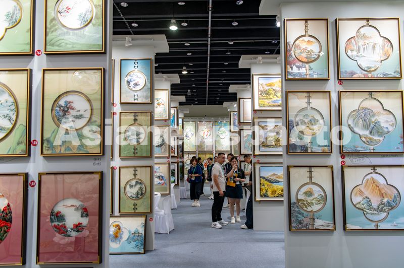 图片说明:2025年9月18日,浙江省金华市义乌国际博览中心里,国内外客商在第 25 届中国框业与装饰画展览会上参观洽谈中。