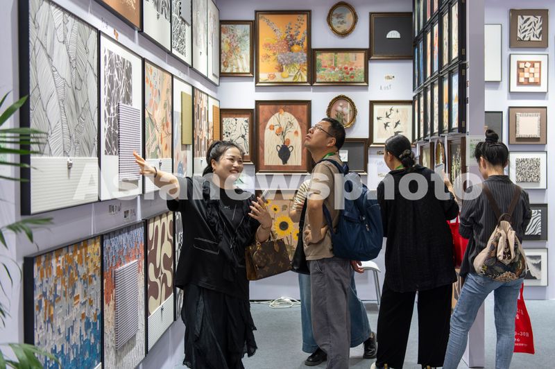 图片说明:2025年9月18日,浙江省金华市义乌国际博览中心里,国内外客商在第 25 届中国框业与装饰画展览会上参观洽谈中。