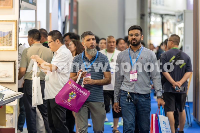 图片说明:2025年9月18日,浙江省金华市义乌国际博览中心里,国内外客商在第 25 届中国框业与装饰画展览会上参观洽谈中。