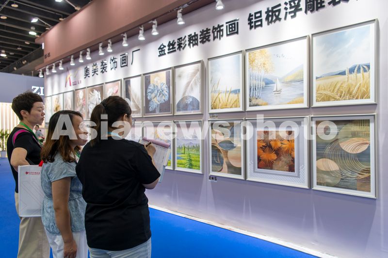 图片说明:2025年9月18日,浙江省金华市义乌国际博览中心里,国内外客商在第 25 届中国框业与装饰画展览会上参观洽谈中。