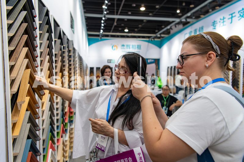 图片说明:2025年9月18日,浙江省金华市义乌国际博览中心里,国内外客商在第 25 届中国框业与装饰画展览会上参观洽谈中。
