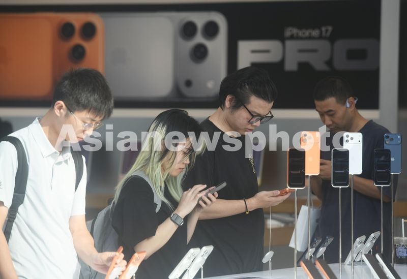 2025年9月19日, “果粉”在苹果杭州旗舰店内体验iPhone17。