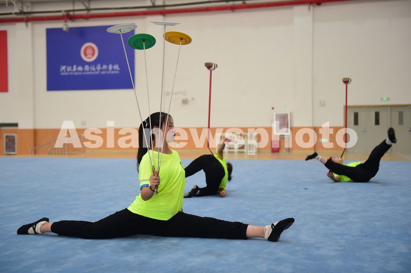2025年9月18日,吴桥杂技艺术学校的孩子在练习杂技表演项目“转碟”。