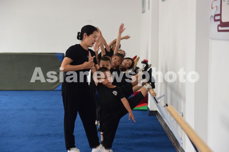 2025年9月18日,吴桥县刁家班杂技小院里,孩子们在练习基本功。