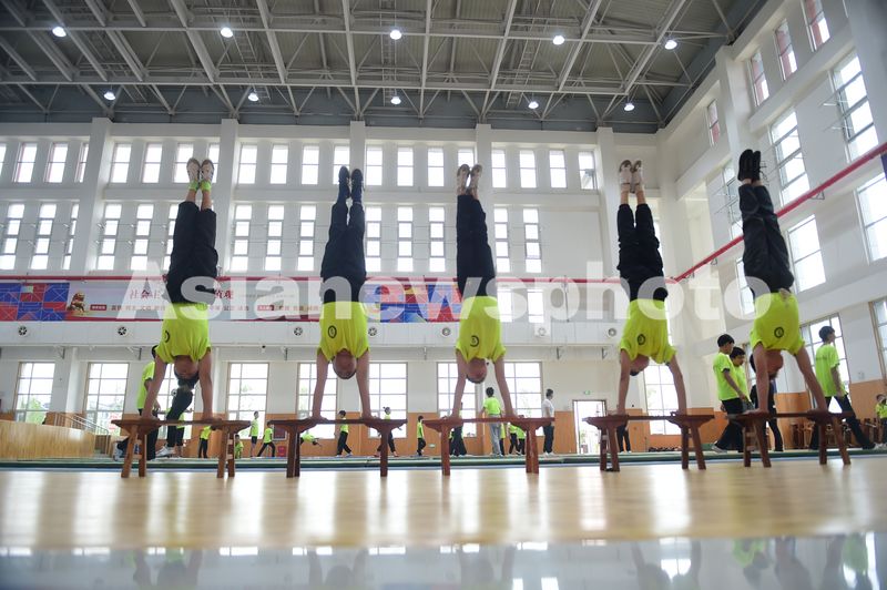 2025年9月18日,吴桥杂技艺术学校的孩子在练习基本功。
