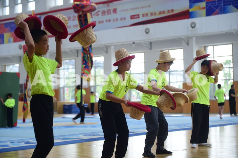 2025年9月18日,吴桥杂技艺术学校的孩子在练习杂技表演项目“抛草帽”。