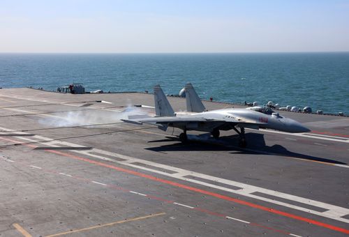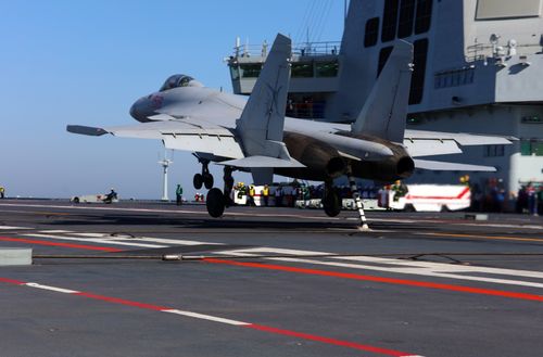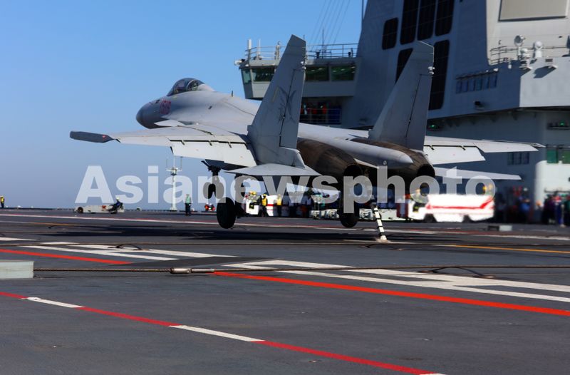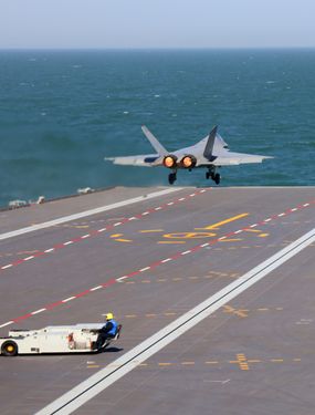 歼-15T舰载战斗机在海军福建舰阻拦着舰。这是战机着舰挂索瞬间。李唐 摄