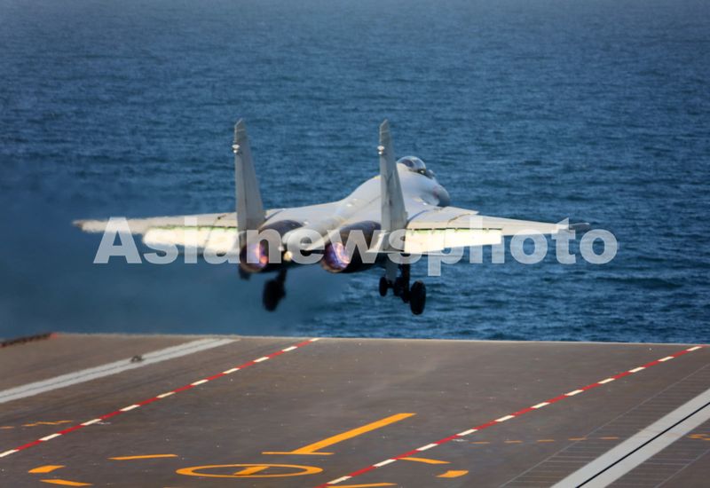 歼-15T舰载战斗机在海军福建舰电磁弹射起飞。这是战机离舰瞬间。李唐 摄.