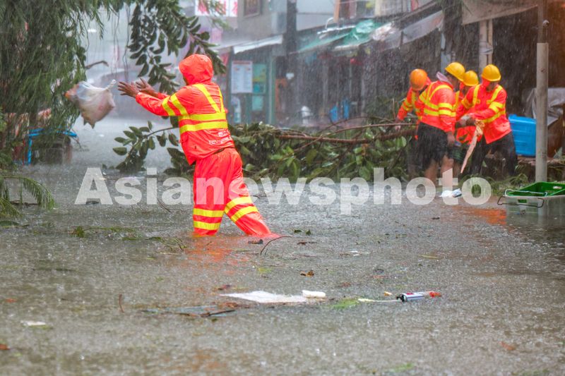 9月24日,工作人员在香港鲤鱼门水淹地带清理障碍物。