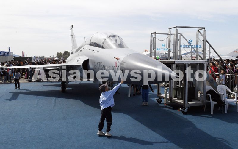 图片说明:小朋友观赏静态展示的FC-1B枭龙双座战斗教练机。