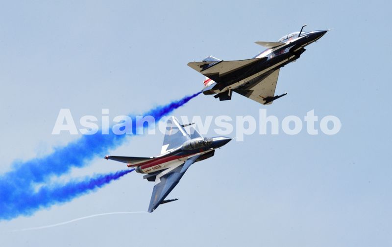 图片说明:空军“八一”飞行表演队,歼-10双机表演,一架直飞。另一架环绕飞行,”交叉“瞬间有惊无险。