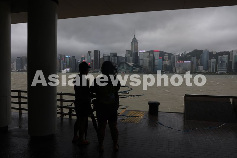 9月24日,香港尖沙咀,游客冒着风雨出行。