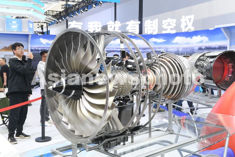 图片说明:展馆里中国航发集团带来的飞机发动机展品。