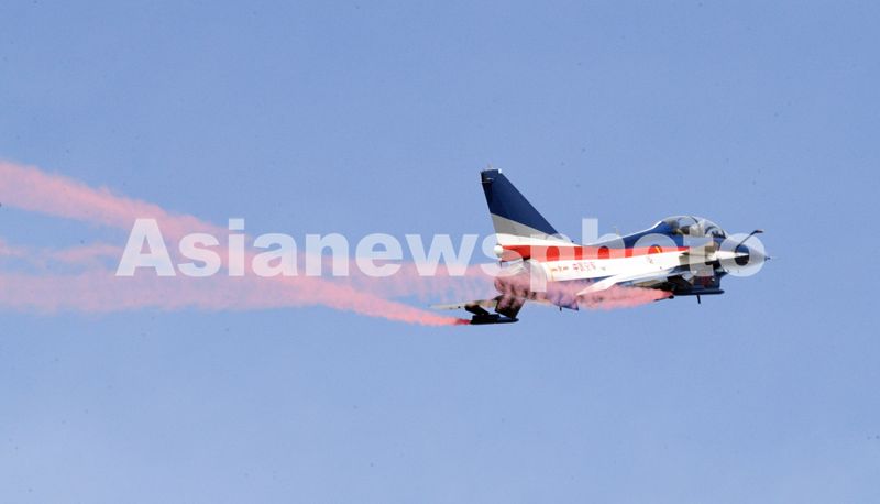 图片说明:空军“八一”飞行表演队,歼-10单机滚转表演。