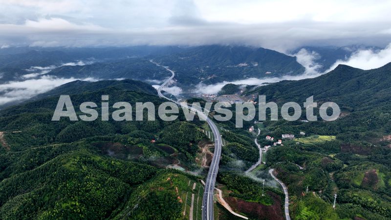图片说明:2025年9月25日,江西省吉安市遂川至赣州市大余高速公路(遂大高速),似巨龙蜿蜒于青山绿水间,桥梁跨河越谷,在云雾缥缈中气势恢宏。