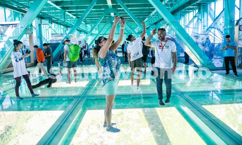 9月28日,人们在贵州花江峡谷大桥廊道玻璃观光大厅上参观。