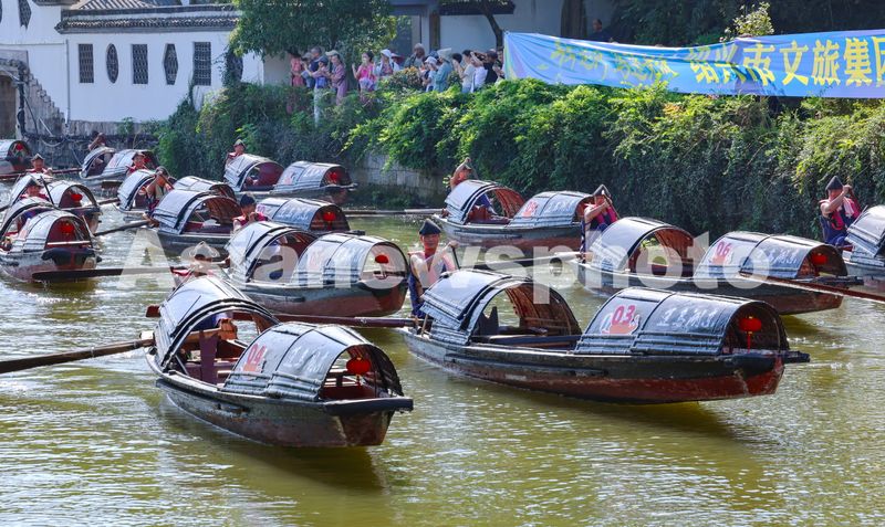 浙江绍兴:76艘乌篷船竞渡浙东运河迎国庆 查看组图