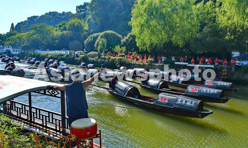 浙江绍兴:76艘乌篷船竞渡浙东运河迎国庆 查看组图