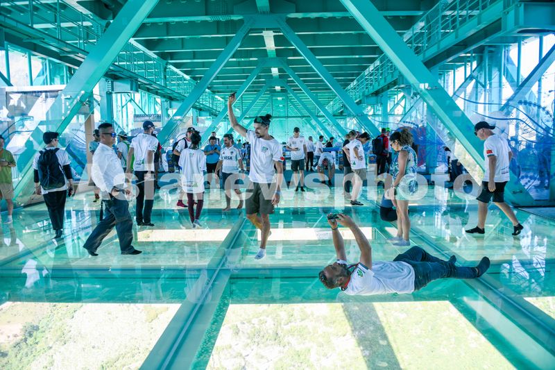 9月28日,人们在贵州花江峡谷大桥廊道玻璃观光大厅上参观。