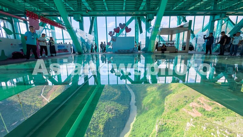 9月28日,人们在贵州花江峡谷大桥廊道玻璃观光大厅上参观。