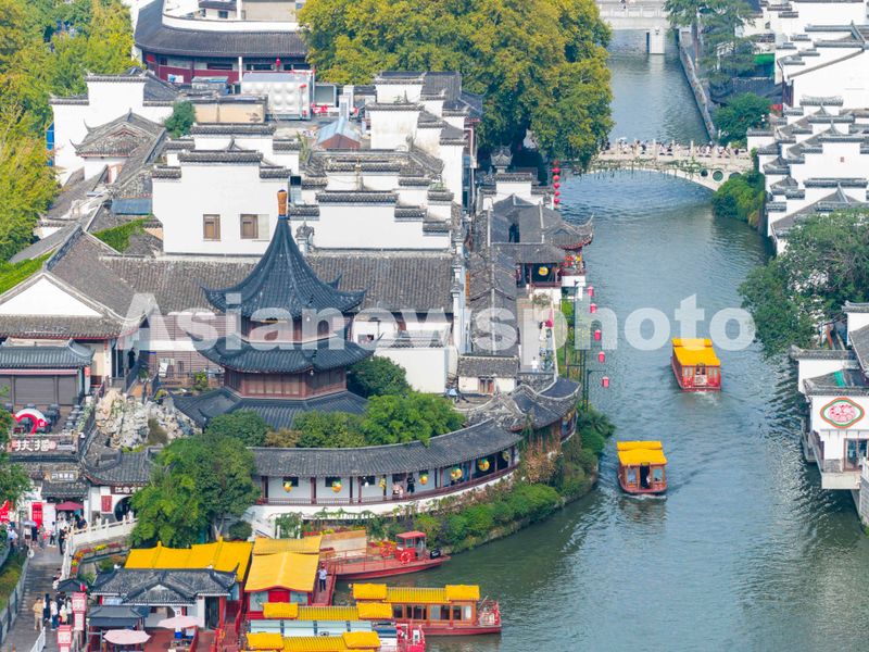 图片说明:2025年10月5日,游客在南京夫子庙景区参观游玩。