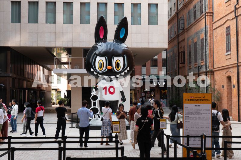 2025年10月15日,上海外滩源正在举办LABUBU十周年巡展,广场上的拉布布雕塑吸引众多粉丝打卡拍照。