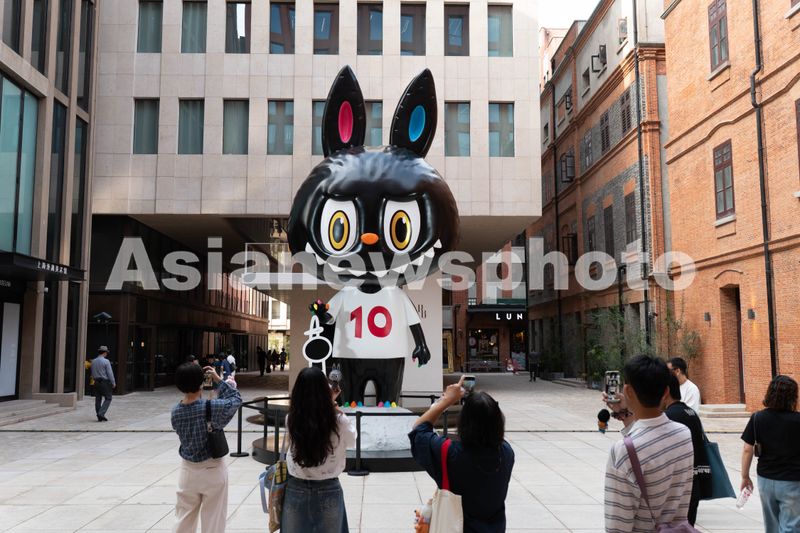 2025年10月15日,上海外滩源正在举办LABUBU十周年巡展,广场上的拉布布雕塑吸引众多粉丝打卡拍照。