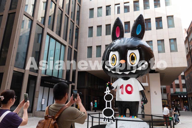 2025年10月15日,上海外滩源正在举办LABUBU十周年巡展,广场上的拉布布雕塑吸引众多粉丝打卡拍照。