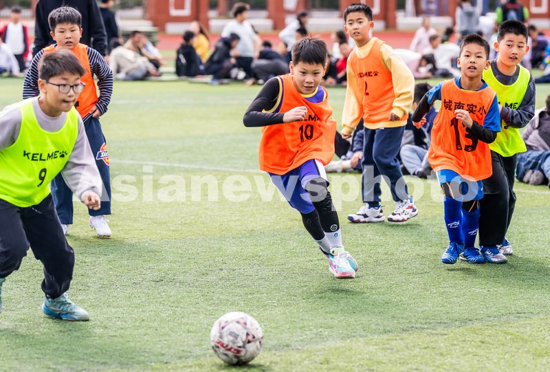 2025年10月22日,江苏省海安市城南实验小学小学的操场上,学生在进行足球比赛。