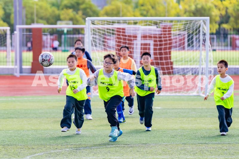 2025年10月22日,江苏省海安市城南实验小学小学的操场上,学生在进行足球比赛。