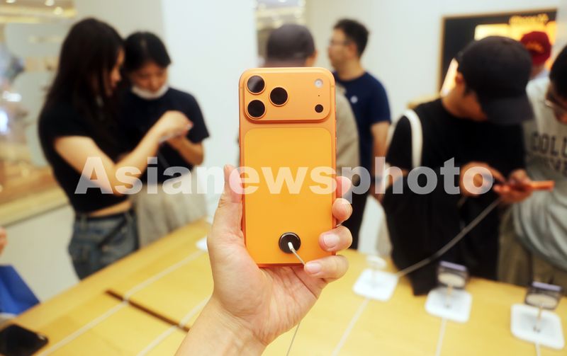 2025年10月22日,上海,苹果旗舰店内消费者体验带有升级A19芯片的iPhone 17系列新款手机。据报道,苹果该系列手机自上市以来需求超出预期,在中国和美国销量比上代16系列均高出14%,苹果公司股价一度创新高。